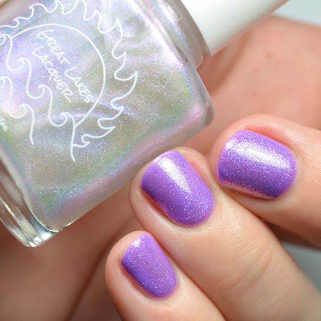 Finish: Dazzling periwinkle blue crelly filled with pink/purple/blue, and red/gold/green chameleon flakies, red/gold/green aurora shimmer and sparkling with micro holo flakies