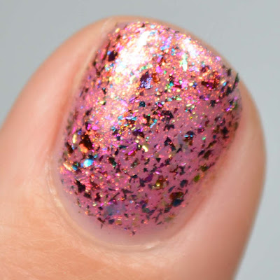 Finish: sheer pink jelly holding a rainbow multichrome flaky bomb, with a red/gold/green glow and pink/orange iridescent flakies